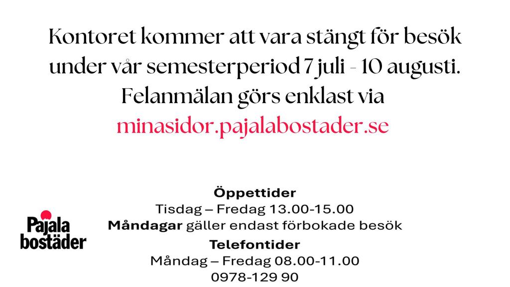 🌞 Semesterstängt kontor 🌞 Vi vill meddela att vårt kontor är stängt för besök under semesterperioden från 7 juli till 10 augusti. Behöver du komma i kontakt med oss under denna tid? Skicka gärna ett mejl eller ring – vi kollar av våra meddelanden med jämna mellanrum och återkommer så snart vi kan. Felanmälningar görs enklast på minasidor.pajalabostader.se Vi önskar er en riktigt härlig sommar!